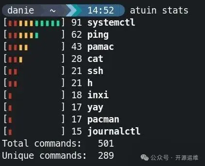 除了核心的搜索与同步,Atuin 还附带了一些提升效率的小工具。例如,你可以通过命令行直接分析自己的使用习惯,统计出最常用的命令是哪些。或者,利用强大的查询能力,筛选出过去一周内所有成功的 make 构建命令。这些功能对于复盘工作模式、优化常用命令别名来说,提供了数据驱动的洞察。