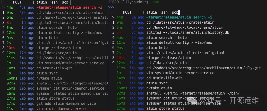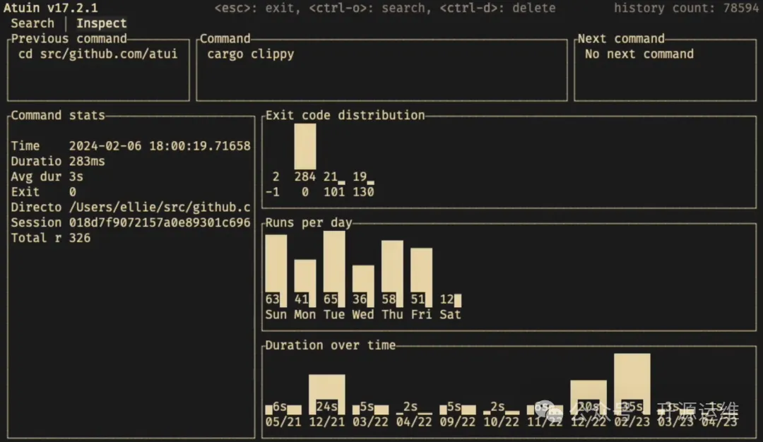 更值得一提的是,Atuin 保存的远不止命令文本本身。它为每一条命令都附上了丰富的“上下文元数据”:包括命令的退出码(成功还是失败?)、精确的执行时间戳、运行时的所在目录、主机名以及会话 ID。