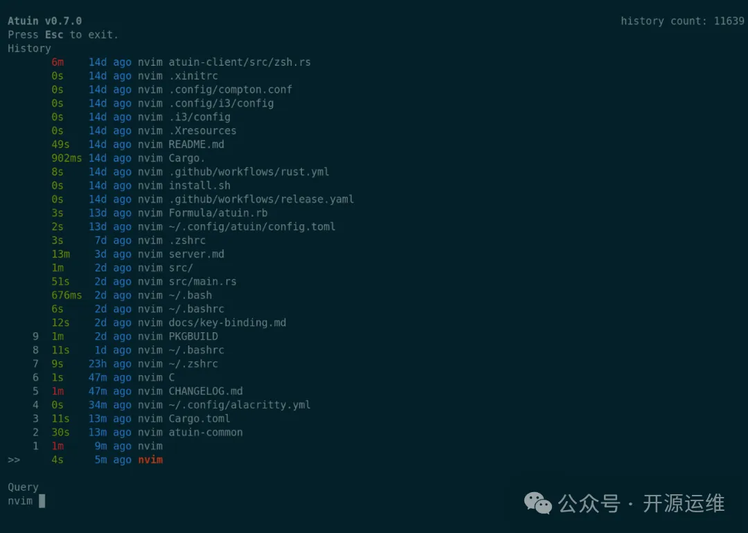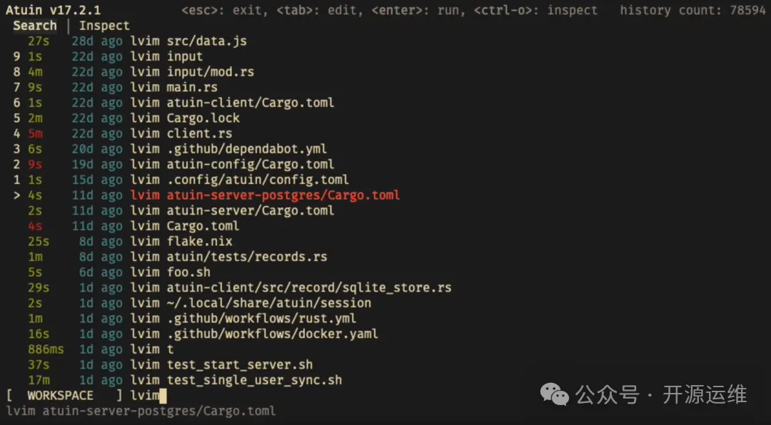 首先,它彻底重构了历史命令的检索体验。Atuin 将常用的 Ctrl-R 和上箭头键重新绑定,唤出的不再是一个简单的行内列表,而是一个清晰的全屏搜索界面。