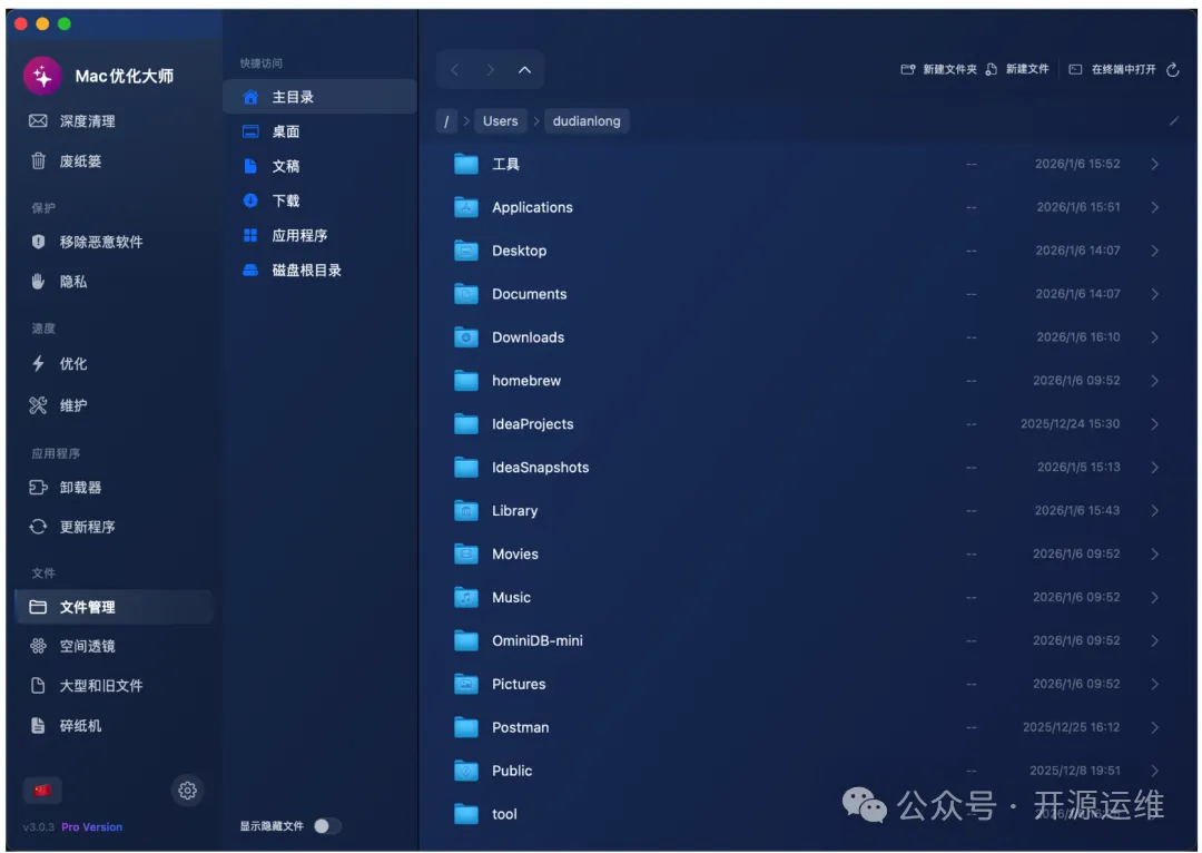 为了方便高级操作,工具内部还集成了一个轻量级的文件浏览器。用户无需切换至Finder,即可浏览磁盘、查看文件,并执行新建文件夹、删除文件等基本操作。尤其值得一提的是“在终端中打开”当前目录的一键功能,对于开发者或需要频繁使用命令行的用户来说,这个设计相当贴心。