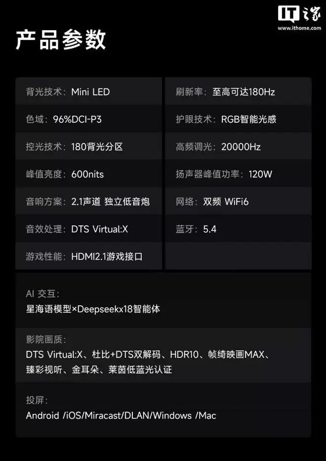 画质方面,这款“小钢炮”的硬件配置相当扎实。它采用了一块支持180Hz高刷新率的Mini LED面板,色彩表现上支持10-Bit色深,能够覆盖96%的DCI-P3广色域。为了应对环境光干扰,屏幕还配备了AG抗光层和LR低反射膜,最高亮度可达600尼特。更智能的是,电视内置了环境光传感器,能够根据周围光线条件,自动调节屏幕的色温和亮度,以提供更舒适的观看体验。