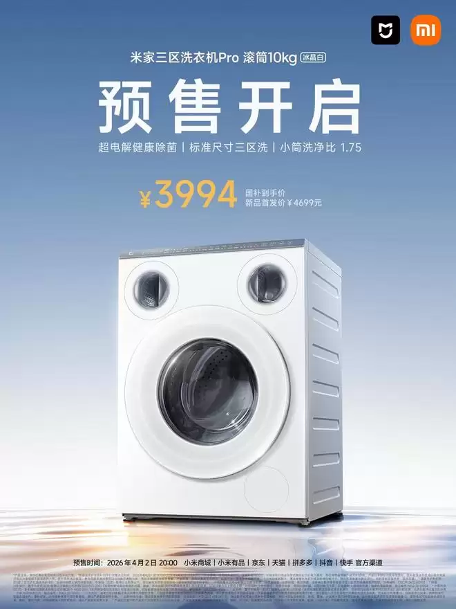 昨晚,小米正式发布了米家三区洗衣机 Pro 滚筒 10kg 冰晶白,并同步开启了预售。这款新品的官方首发定价为4699元,但如果算上国家补贴,实际到手价可以压到3994元。感兴趣的消费者不用等太久,4月10日晚上8点,它就将正式开售。