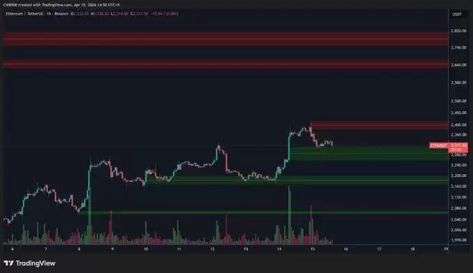 在币安的1小时图表上,以太坊(ETH/USDT)价格在2317.50美元附近整理后,回落至一个绿色的支撑区域。CW将这个区域比喻为“买盘墙”,意味着这里可能聚集了相当的买单,试图托住价格,减缓回调的势头。图表同样揭示,以太坊在经历近期一轮强势上涨后,未能有效站稳附近的高点阻力。