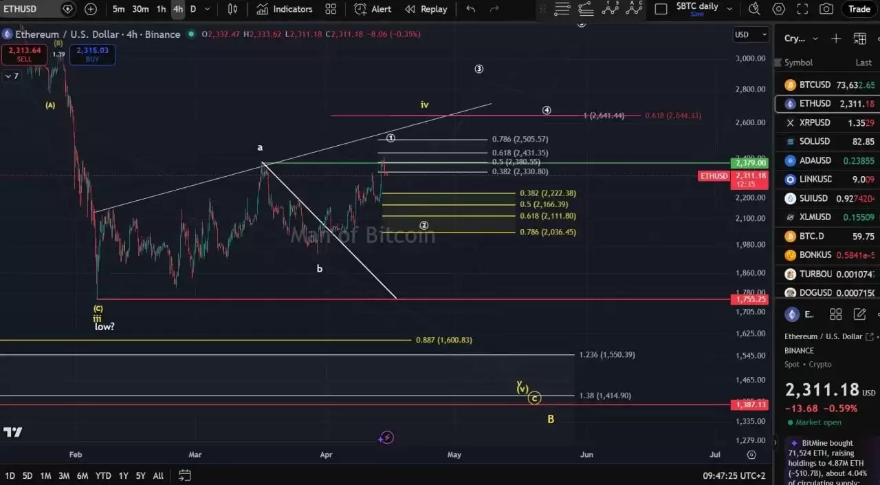 从4小时图来看,以太坊在触及2380美元附近的局部高点后回落,目前价格在2311美元附近徘徊。当前的走势被普遍解读为一次健康的回调,下方存在一系列由斐波那契工具标识的支撑位。具体来看,2222美元、2166美元、2111美元和2036美元这几个关键价位,共同构筑了预期中第二浪回调的主要防线。