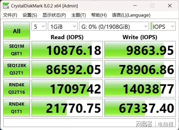 性能方面,最新标称2TB版本的顺序读取和写入速度分别为11000MB/S和10000MB/s,这个数据在PCIe 5.0 SSD中不算顶级的,但也属于次旗舰的水平了。首先进行的CrystalDiskMark测试,宏碁ACER N8000顺序读取速度11404.5MB/s,顺序写入速度10343.1MB/s,测试成绩还超过了标称的峰值速率,在更考验日常系统流畅度的随机性能方面,4K Q32T16随机读写速度分别达到7003.1MB/s 和5750.28MB/s,随机读取次达到1709K IOPS,随机写入次数为1403K IOPS,都是非常优秀的表现。