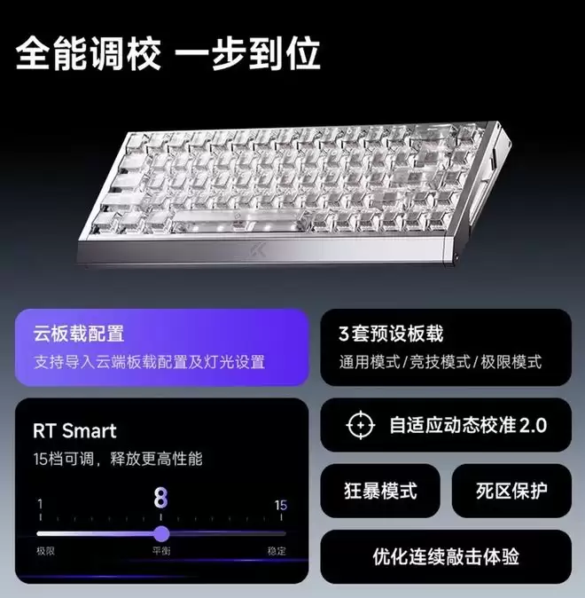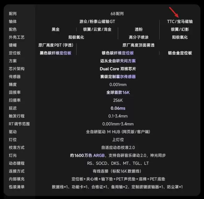 当然,真正的重头戏还在性能层面。官方强调,这款键盘继续搭载迈从全自研的“天问”方案,并宣称实现了全球首款16K回报率。这意味着它能提供低至0.06ms的赛事级延迟,以及0.001mm的触发精度,理论上能为竞技游戏带来更跟手的操作体验。不过,为了匹配新的磁轴,这款“宝马磁轴”版本将其他版本使用的碳纤维定位板调整为了铝合金材质,这或许会带来不同的手感反馈。