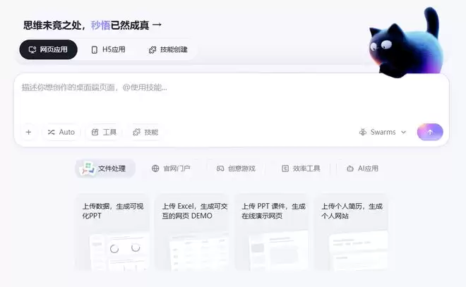 除了基础的快速生成能力,Meoo还有一个颇具亮点的创新功能:蜂群Agent模式。简单来说,它可以指挥多个AI智能体并行处理任务。当面对复杂需求时,用户可以选择启用这个模式,Meoo便能自主进行任务规划与拆解,甚至在遇到问题时,还能进行自我检测和修复,这无疑大大提升了处理复杂项目的可行性。