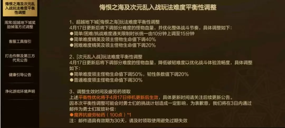 不过,玩家们也无需过度焦虑。项目组已发布公告,将对“悔恨之海”和“次元乱入战”进行紧急难度下调,该调整将于本周五更新后实装。想要提前体验高难挑战的玩家,现在即可前往尝试;若感觉压力过大,不妨等待周五更新优化后再行挑战。