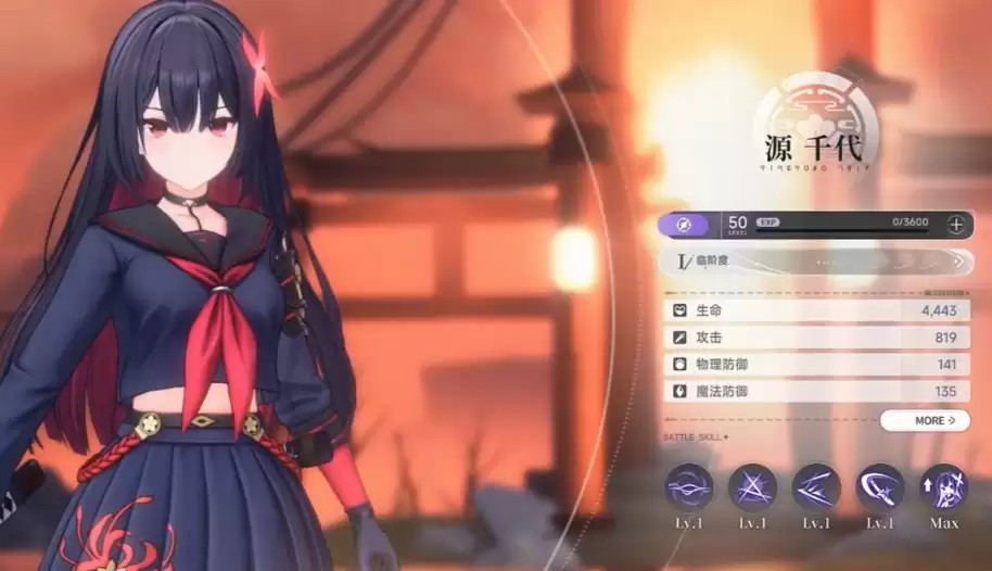 其中,源千代是阵容中无可争议的输出核心,承担着主C的职责。她出身于祈云阵营,以迅捷致命的太刀进行战斗。其普通攻击在连续命中后,能够叠加名为“鬼火”的特殊状态;当层数叠满时,下一次普攻将转化为一次强力的额外暗属性斩击,显著提升瞬间伤害。而她的核心技能——“星鸣斩”,则能对前方扇形区域造成多段高额暗属性伤害,是快速清剿杂兵与削减精英目标血线的主力手段。