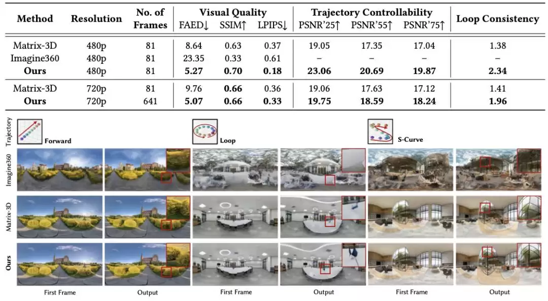 数据方面则采用了“虚实结合”的策略:真实的全景视频提供了丰富的场景多样性,而合成的数据则提供了精确的轨迹监督。通过路径规划算法,确保了所有运动轨迹的合理性。在评测上,团队提出了一个巧妙的闭环一致性指标:要求模型生成的视频在沿着一个闭环路径“行走”一圈后,不仅能回到起点,还要保持中间过程的合理变化。这个指标更能衡量长时序下的空间一致性。