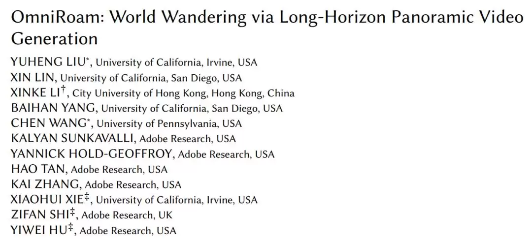 最近,来自加州大学欧文分校、加州大学圣地亚哥分校、香港城市大学、宾夕法尼亚大学以及Adobe Research的研究团队,共同交出了一份名为OmniRoam的答卷。这项研究瞄准的,正是轨迹可控的长视频生成。