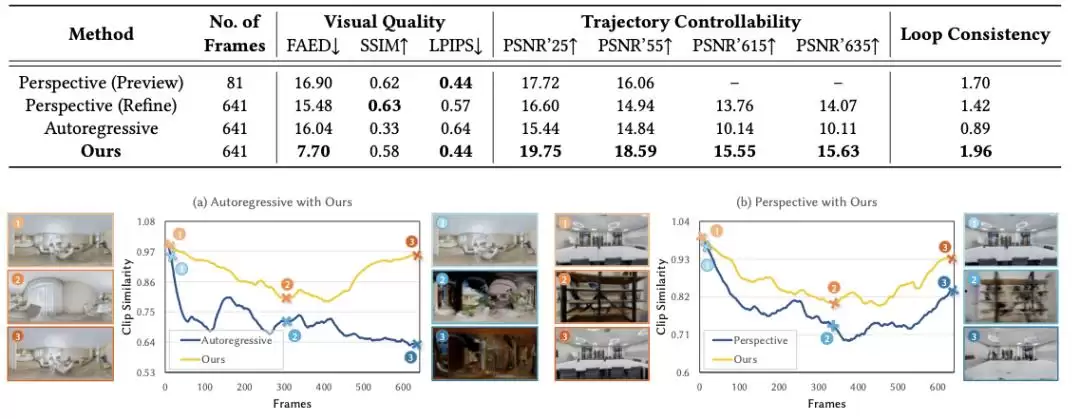 为了进一步探究长时序一致性,作者设计了一个闭环轨迹实验,并用CLIP图像相似度来衡量模型能否“走回原点”。理想情况下,随着相机逐渐远离起点,相似度应逐步下降;而当轨迹完成闭环时,相似度应重新上升。实验结果正如所料:相似度曲线在中段下降,在末尾重新回升,这有力地证明了模型具备了较强的长期空间记忆能力。