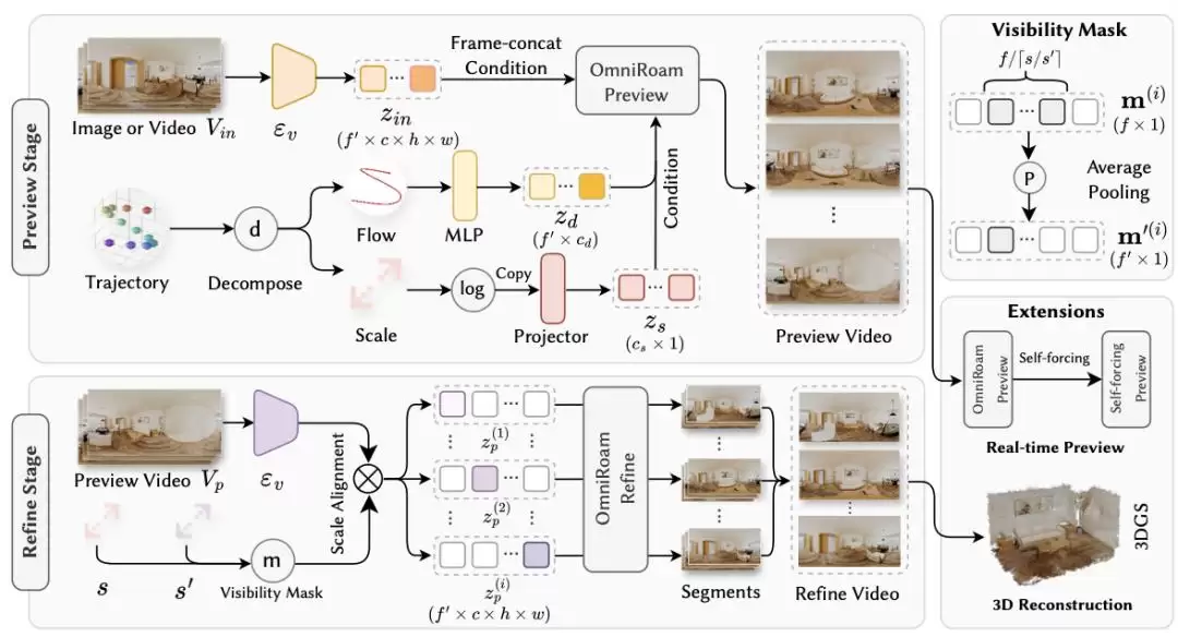 OmniRoam的第一步,是生成一个中等分辨率的全景视频“预览”。这就像在动工前先画一张设计蓝图,目的是确定整体的运动路径和场景结构。