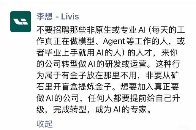 他核心表达了一个意思:企业在搭建AI团队时,应当谨慎招聘那些“非原生”的AI人才。这里说的“非原生”,指的是并非每天从事模型、智能体等核心AI工作,或者毕业后没有直接上手使用AI技术的人。如果让这类人才进入公司后,再转型从事AI的研发或运营岗位,在李想看来,这并非明智之举。