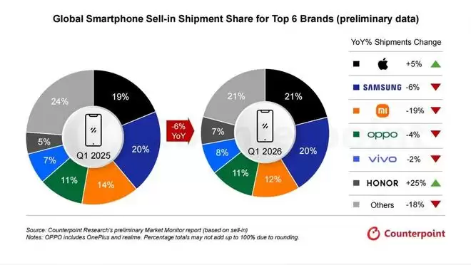 2026年第一季度全球智能手机出货量下滑6%,荣耀、苹果逆势增长