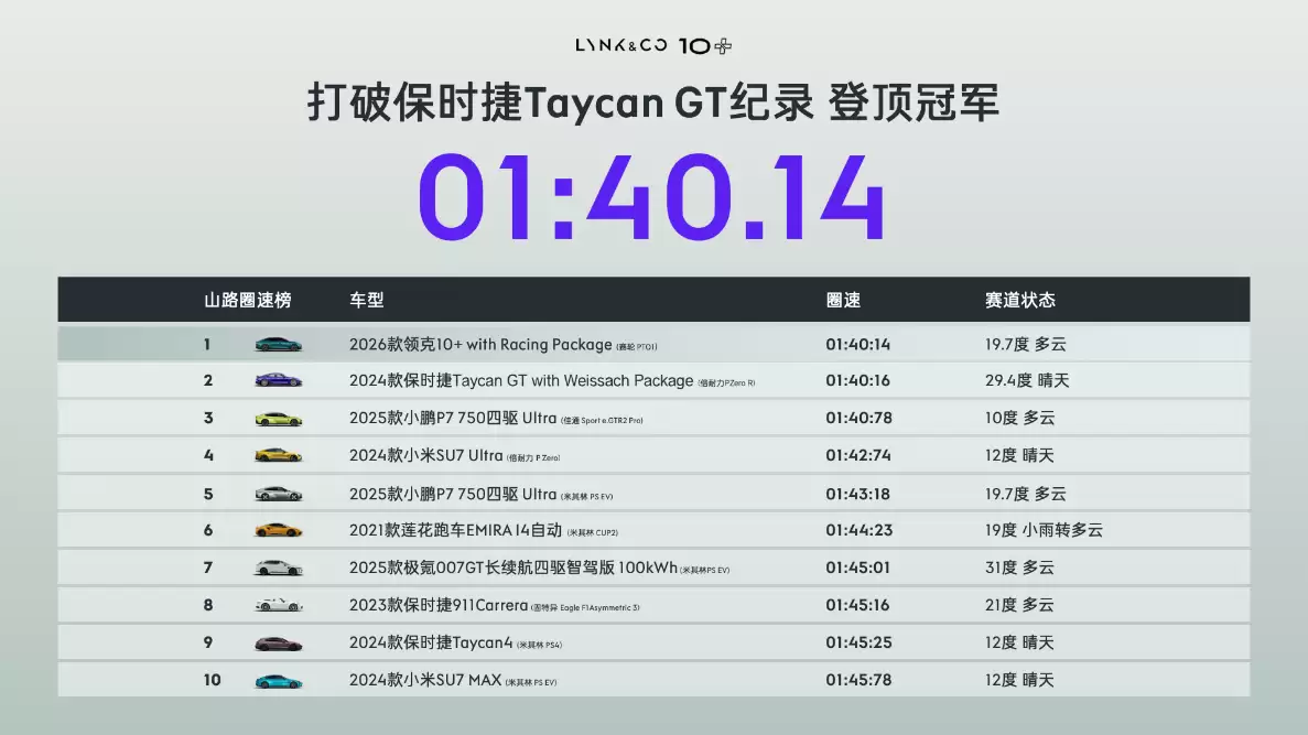 如果说数据是性能的注脚,那么赛道就是最好的试金石。这一次,领克玩得足够硬核。领克首次以“+”之名打造的极致运动座驾——领克10+,在联合领克汽车运动部门进行赛道级调校,并加持最新性能套件后,交出了一份令人瞩目的成绩单:在亚洲山脊赛道上,它以1分40秒14的圈速,超越了保时捷Taycan GT,成功登顶“弯道之王”。这个成绩,绝非偶然,它清晰地强化了领克在纯电运动领域的引领地位。