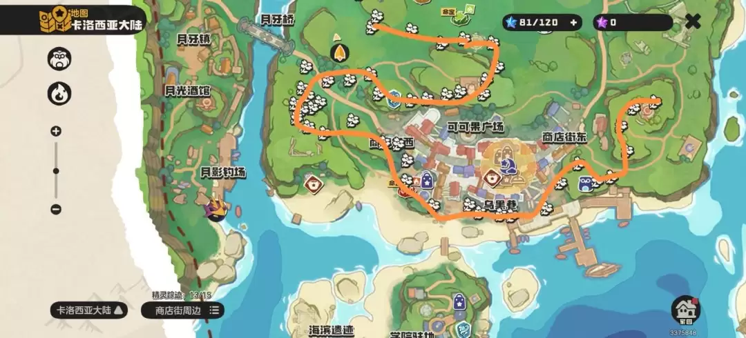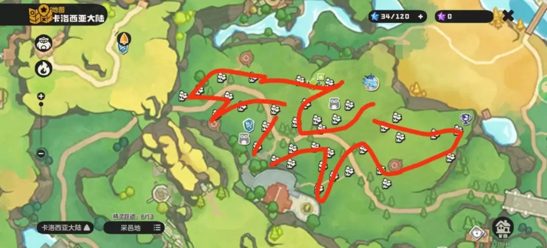 首先参考下图中的两条初级采集路线——它们看似范围不大,但实际跑动收益相当可观。完整跑完一圈,运气不错的情况下,总计能够收获约300个光合球(这是一种可以进行场外投掷的高级精灵球)。