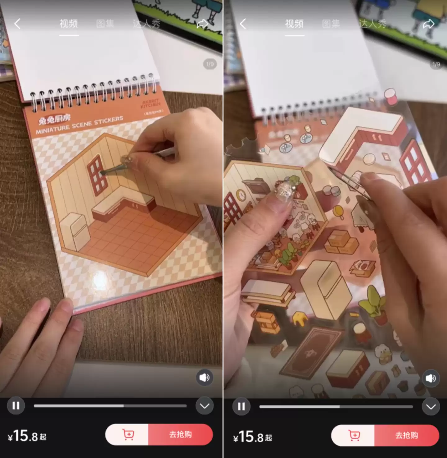 一种是购买材料包自行创作,价格从几元到数百元不等,抖音上销量最高的TOP10产品中,有6款销量均已突破10万件。另一种消费则源于直播种草——主播展示造景贴纸制作的全过程,观众在“云体验”这种沉浸式解压感的同时,就被成功转化下单。