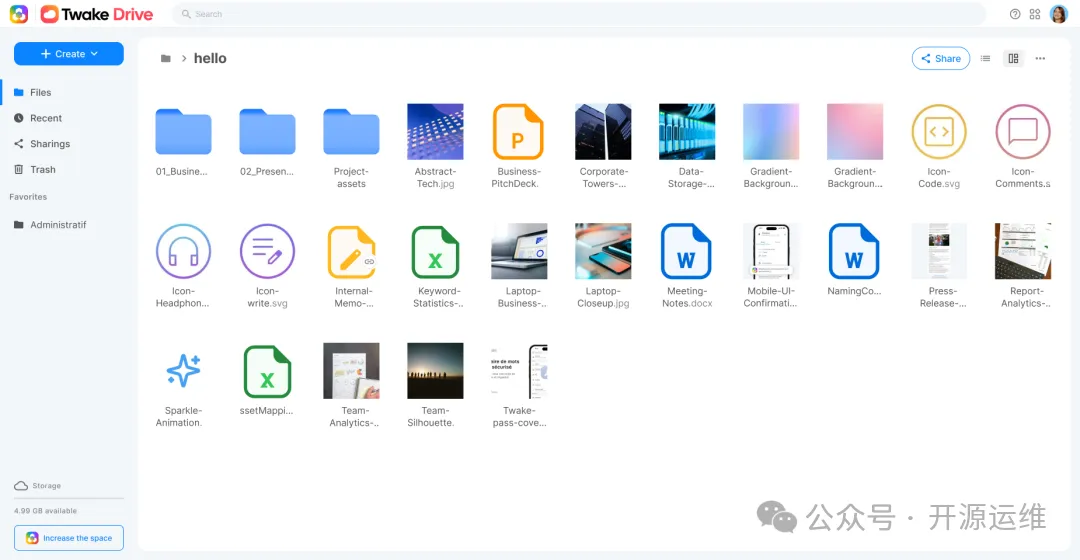 简单来说,Twake Drive是一个开源、自托管的文件管理与共享系统。它提供了类似Google Drive的文件树浏览、上传下载以及协作分享功能,但所有数据的存储与控制权都完全归属于部署者自身。