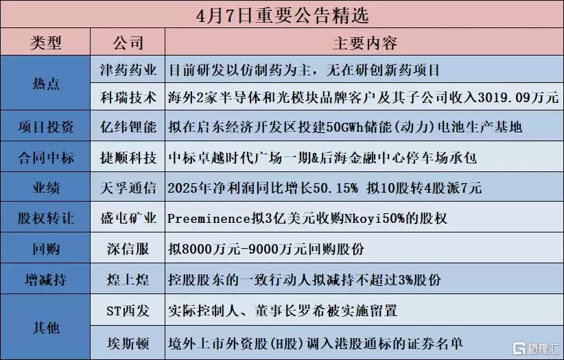 公告精选︱天孚通信:2025年净利润同比增长50.15% 拟10股转4股派7元;香农芯创:预计第一季度净利润同比增长6714.72%-8747.18%