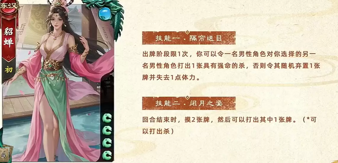 作用:此技能提供了游戏中最稳定的手牌补给。它确保了貂蝉在任何战局下都拥有充足的资源储备,几乎不会陷入断牌的尴尬境地,始终保有防御、进攻或使用锦囊的主动权。这是貂蝉所有战术实施的基石,奠定了她“以稳求进”的打法风格。