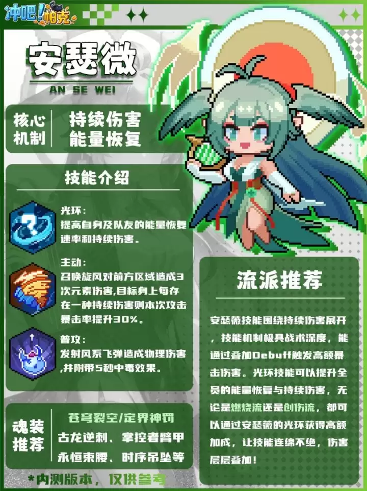 而她的“能量潮汐”光环,堪称持续伤害队伍的“核心引擎”。它不仅加速了整个团队的技能释放频率,使攻击节奏如潮水般连绵不绝,还直接强化了每一层持续伤害的效果。因此,无论是专注于烈焰灼烧的燃烧流派,还是擅长造成深层创伤的创伤流派,安瑟薇都能完美融入并提供巨额增益,真正实现“伤害层层叠加,越战越强”的战斗体验。
