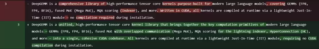 基于Mega MoE等更新,DeepSeek也对DeepGEMM库的描述进行了调整: