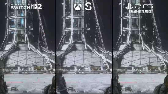 最后一组超宽画幅对比堪称总结性呈现。画面并排之下,左侧 Xbox Series S 的苍白平淡与右侧 Switch 2 的浓郁风格形成强烈反差。这不禁让人追问:是 XSS 的 GPU 性能未被充分释放,还是开发资源向新平台(Switch 2)倾斜导致了优化程度的差异?这一问题值得硬件厂商与游戏开发者共同关注。
