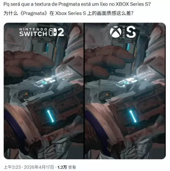 近期,游戏圈内围绕《识质存在》的画质表现展开了热烈讨论,焦点集中在微软 Xbox Series S 与任天堂尚未官宣的 Switch 2 之间。有玩家放出了疑似两款设备运行同一游戏的实机画面对比,结果令人颇感意外——作为家用主机的 Xbox Series S,在视觉呈现上竟被一款掌机超越,引发众多玩家对“性能参数”与“实际观感”之间关系的重新思考。