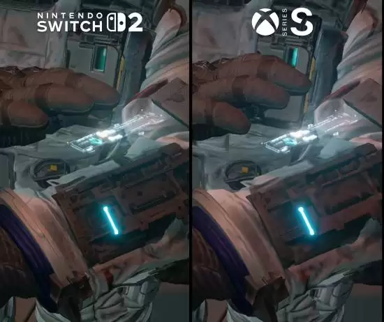 首先来看第一组场景对比。左侧 Xbox Series S 版本的画面,光影过渡较为平缓,材质纹理在放大后清晰度不足,显得有些模糊。而右侧标注为 Switch 2 的画面,尽管分辨率可能不占优势,但在色彩饱和度、明暗对比方面处理得更加到位,整体视觉感受反而更加饱满、生动,细节呈现也更扎实。