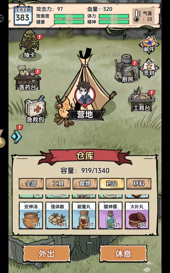 接下来的生存阶段将变得相对简单:核心是确保充足的食物储备,每日维持高于系统提示消耗值的饱食度即可。当生存无忧后,你的核心策略是:指挥动物伙伴外出收集用于抽奖的“石头”,自己则专注于刷生存天数、完成各类成就任务,并挖掘地图上的矿产。