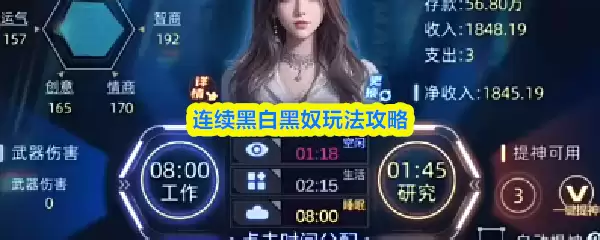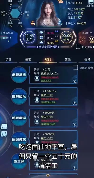 然而,角色并非永动机,“提神”状态会进入冷却。这引出了黑奴玩法的关键微操技巧——提神冷却期的效率转换策略。当所有提神选项均处于冷却时,应果断暂停游戏,重新规划时间分配:将睡眠调整为充足的8小时;工作可保留1-2小时用于提升职业等级(也可完全取消);饮食、住宿、出行全部切换至最高档位,所有雇佣项目拉满(前提是确保净收入不为负或亏损可控);剩余的全部时间,则集中投入科研。科研方向应重点明确:优先攻关“精力”相关项目,其次是提升工作收入与投资研究等级。例如,选择IT职业应主攻“学习算法”,选择娱乐圈则钻研“演员的自我修养”。待提神状态全部恢复后,再次切换回上述的极限打工配置。
