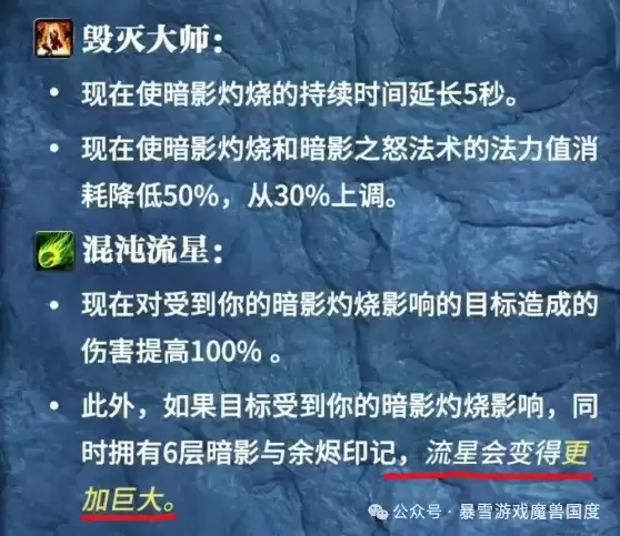 - 同时,使暗影灼烧与暗影之怒的法力消耗降低50%(原为30%)。