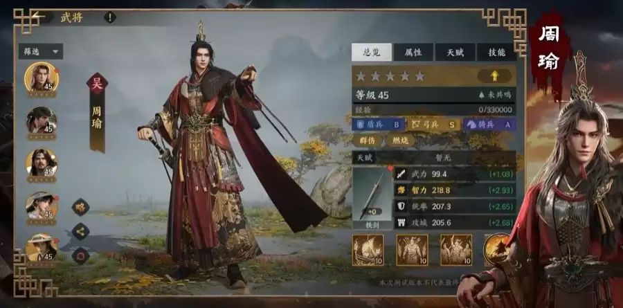 为周瑜搭配阵容,核心思路非常明确:他本就是为大规模团战而生的顶级谋略将领。凭借其大范围技能和独特的燃烧效果,周瑜能打出极为可观的持续范围伤害。到了游戏后期,当命中属性堆叠起来后,他甚至还能获得额外的防御增益。因此,周瑜的核心战术价值就在于“大范围覆盖”与“状态持久灼烧”。