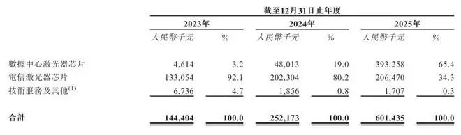 收入结构的变化,清晰地揭示了增长引擎所在。2025年,公司来自数据中心激光器芯片的收入高达3.93亿元,占总收入的65.4%;而电信激光器芯片收入为2.06亿元,占比34.3%。这组数据背后,正是全球AI算力需求爆发与5G建设持续推进的直接体现。