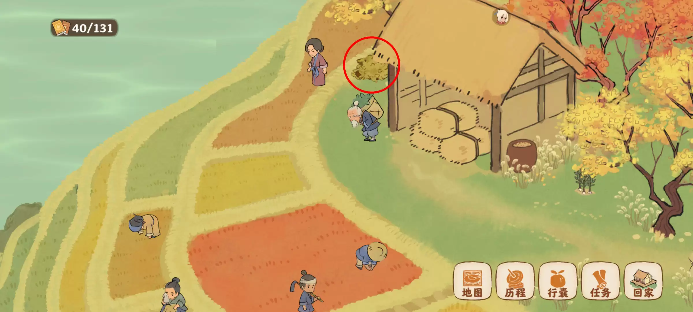 此区域是资源最密集的区域,共有七张场景截图需要逐一排查。宝物与萝卜隐藏于梯田、屋舍及草木丛中。请依照图片顺序,结合红圈绿框标记进行对照寻找。