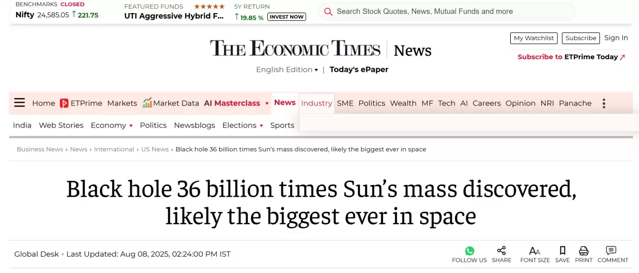 人类发现已知最大黑洞,质量达到太阳363亿倍!