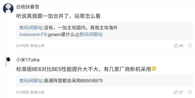 当然,更多人的关注点还是回到了芯片本身。另一位用户直接追问性能对比和采用情况:“标准版 8E6 对比 8E5 性能提升大不大,有几家厂商新机采用”。博主的回答则指向了更广泛的行业采购:“高通阵营都会采购 8950/8975”。这句话的潜台词很明确:新一代旗舰芯片,依然是安卓阵营的集体选择。