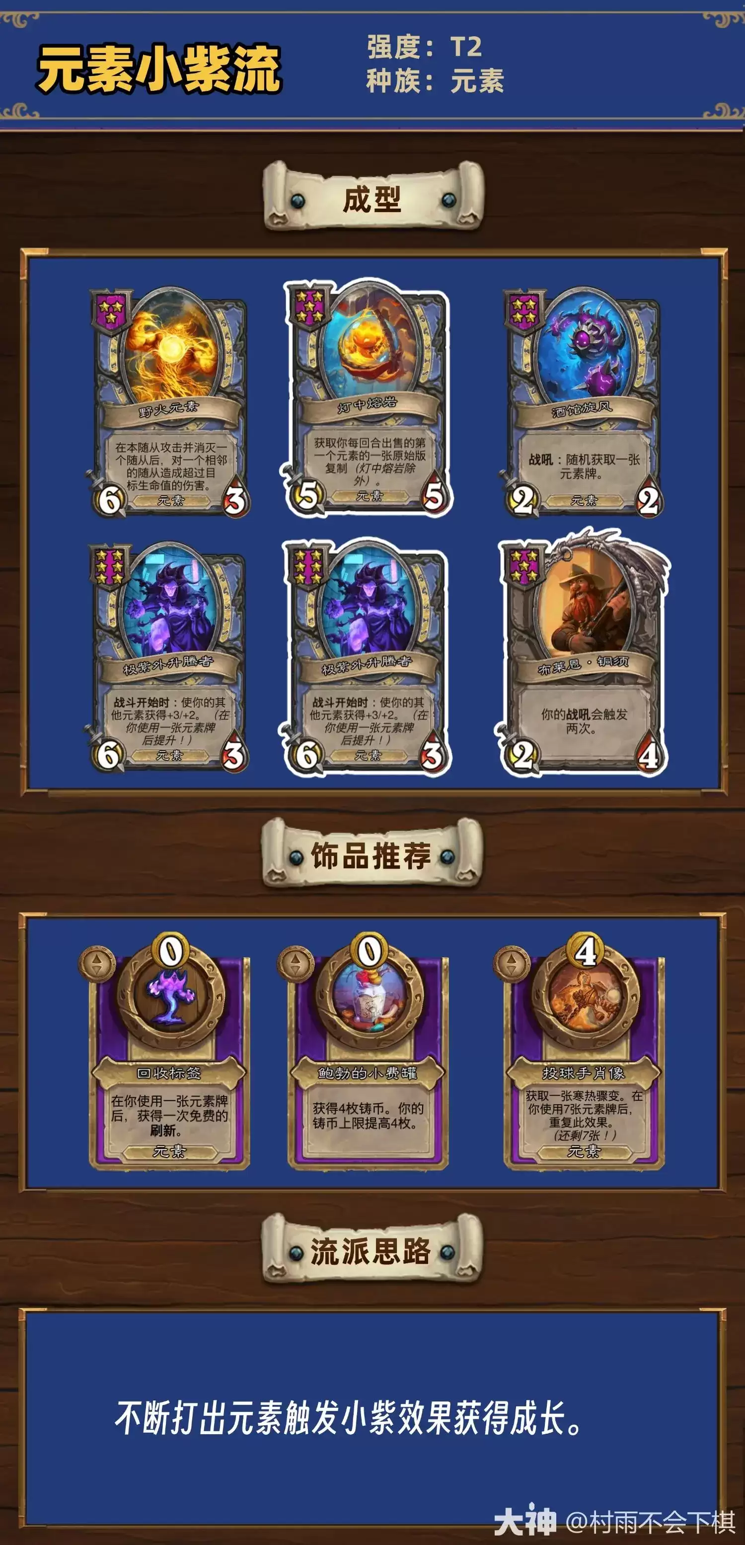 上图所展示的,正是元素极紫流一套经典且强力的阵容构成。其核心思路非常明确:充分利用元素种族自身卓越的成长性与彼此间的配合能力,同时深度激活“极紫”随从的特殊效果,从而在中后期打造出兼具巨型身材、强大特效与持续作战能力的压倒性场面。需要强调的是,这套阵容的发力期通常位于游戏的中段及以后,因此前期的运营策略更侧重于稳健过渡与血量保持。