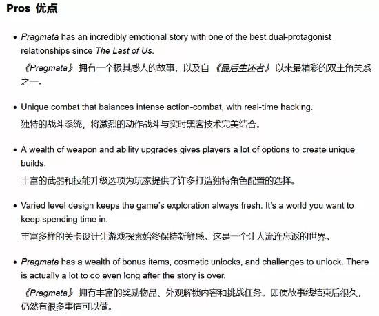 情感充沛、刻画细腻的剧情塑造,双主角之间的关系堪称自《最后生还者》以来最出色的设计之一;独特创新的战斗系统,将高强度的动作射击与实时黑客机制巧妙结合;丰富的武器库与能力升级体系,给予玩家高度自由的Build构筑空间;多样化的关卡与环境设计,让探索过程始终保持新鲜感,构建了一个令人愿意反复沉浸的科幻世界;游戏内容量充足,包含大量奖励物品、外观解锁与额外挑战,即使在通关主线后仍有丰富的可玩内容;