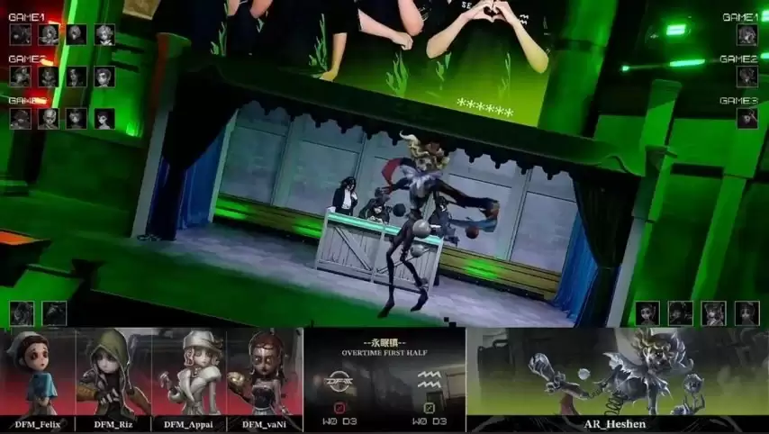 加时赛开启,DFM求生者选择了医生、佣兵、“法罗女士”和咒术师(禁选“跛脚羊”、鹿头);AR监管者Heshen再次拿出“喧嚣”。(BAN位:空军、前锋、幻灯师、机械师)
