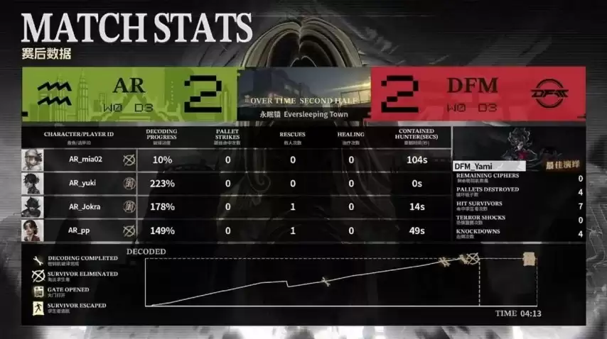 最终,经过四局常规赛和两轮加时赛的漫长鏖战,AR战队以0胜4平0负、总比分18:18,凭借加时赛的时间优势击败了DFM战队,获得了这场COA9全球总决赛小组赛关键战役的胜利。