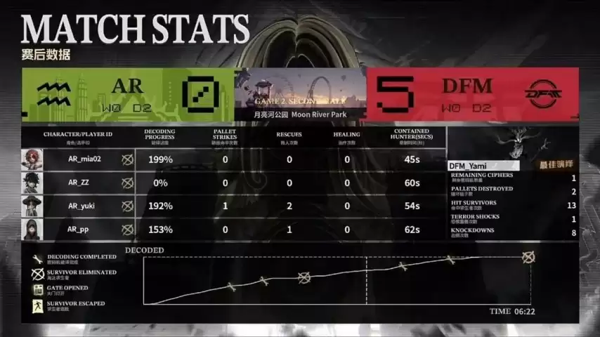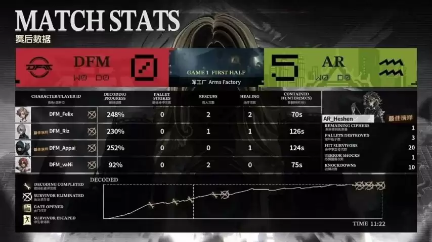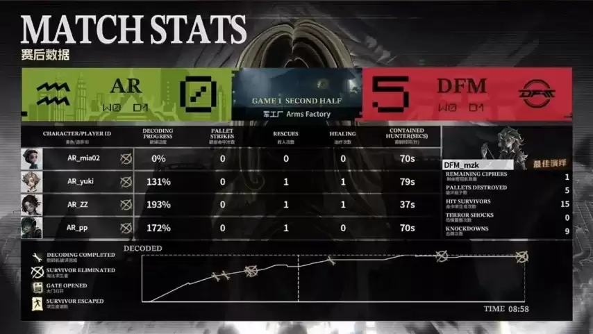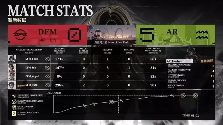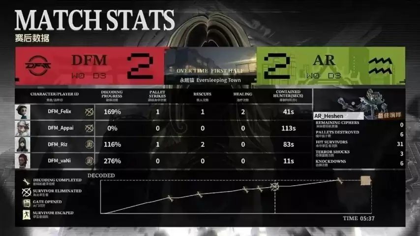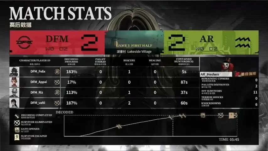 比赛开始后,“台球手”将先知作为首个追击目标。尽管DFM的弓箭手通过精准的技能干扰多次为队友争取了宝贵的破译时间,但Heshen的“台球手”凭借出色的走位与技能预判,最终还是成功击倒先知并将其挂上狂欢之椅。DFM的救援反应迅速,弓箭手成功完成无伤救援。然而,“台球手”立即转换目标,将救援后状态不佳的弓箭手击倒送椅。