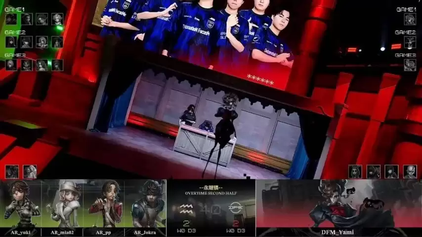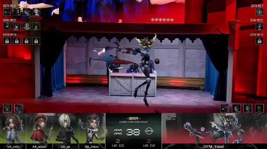 决定胜负的最后一轮,AR求生者阵容为“囚徒”、“法罗女士”、大副和飞行家(禁选“跛脚羊”、蜡像师);DFM监管者Yami选出歌剧演员。(BAN位:祭司、先知、慈善家、“逃脱大师”)