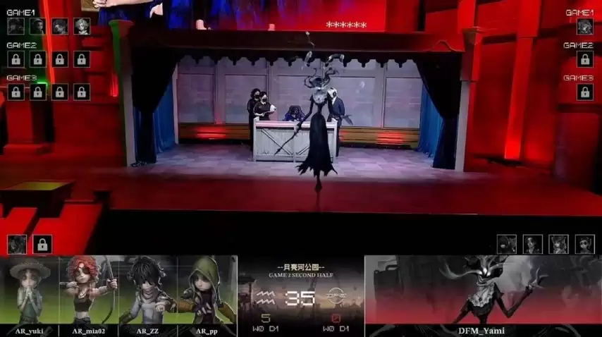 AR求生者选出“心理学家”、画家、守墓人和杂技演员(禁选歌剧演员、“跛脚羊”);DFM监管者Yami使用“喧嚣”应对。(BAN位:先知、哭泣小丑、空军、咒术师)