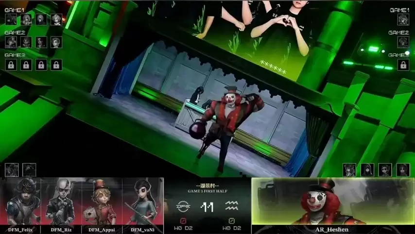 第三局,DFM求生者阵容为飞行家、“逃脱大师”、邮差和古董商(禁选“跛脚羊”、鹿头);AR监管者Heshen选出小丑。(BAN位:幻灯师、佣兵、空军、机械师)