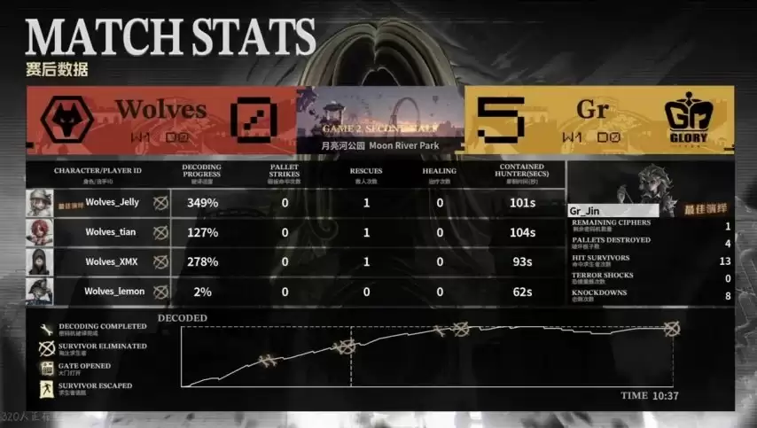 进入后期,Gr_Jin的优势已不可动摇。他持续利用技能控熵,回退密码机进度,并逐个击破,将佣兵和“法罗女士”相继淘汰,最终完成了一场堪称教科书级别的四抓对局。