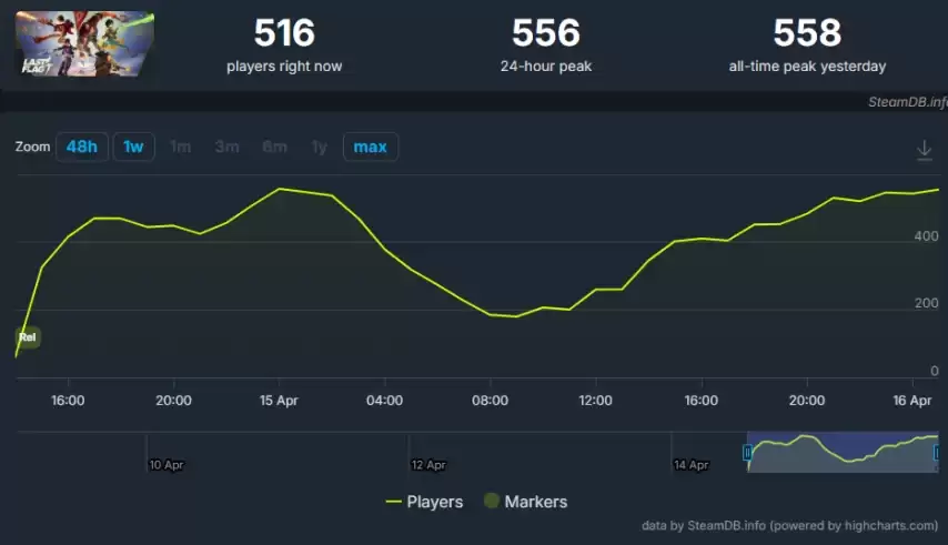 根据SteamDB数据显示,游戏发售当日最高同时在线玩家数仅为558人。对于一款主打5v5团队竞技、依赖快速匹配对战的在线射击游戏来说,这个初始玩家基数意味着匹配队列时间可能较长,且难以维持稳定、活跃的多人游戏环境,开局可谓挑战重重。