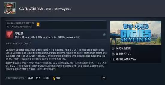 他在评价中吐槽道:游戏频繁的更新导致在安装Mod后几乎无法正常运行,而如果不安装Mod,原版游戏的内容又“糟糕到让人难以忍受”。他批评开发商Paradox Interactive(P社)沉迷于卡通风格和不合理的建筑设计,这些更新带来的种种问题,使得这款游戏对他而言成了“最让人感到愤怒的游戏”。