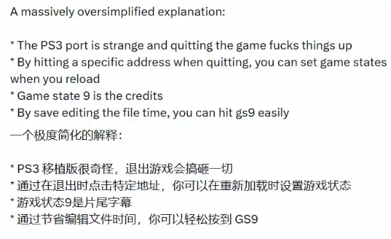 这一现象听似匪夷所思,实则揭示了游戏移植过程中可能遗留的深层机制问题。其核心原理在于PS3版本独有的退出处理逻辑。速通研究者发现,通过特定工具修改游戏存档文件的时间戳数据,可以在执行退出游戏操作的瞬间,精确触发一个隐藏的内存地址。这一操作相当于激活了一个游戏内的“终极状态开关”,直接将游戏进程锁定为“状态9”,即片尾字幕播放阶段。